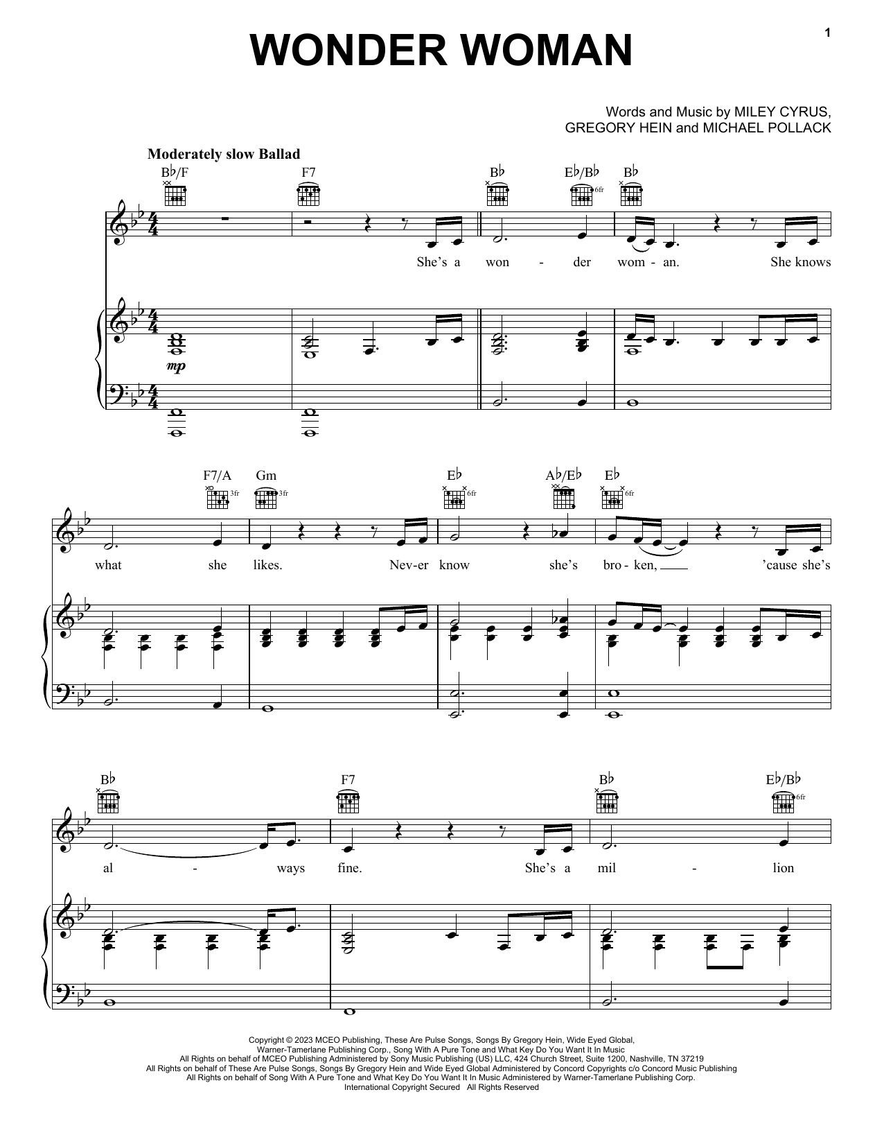Download or print Miley Cyrus Wonder Woman sheet music, chords and digital score arranged for Piano, Vocal & Guitar Chords (Right-Hand Melody). This Pop score includes 4 page(s).
