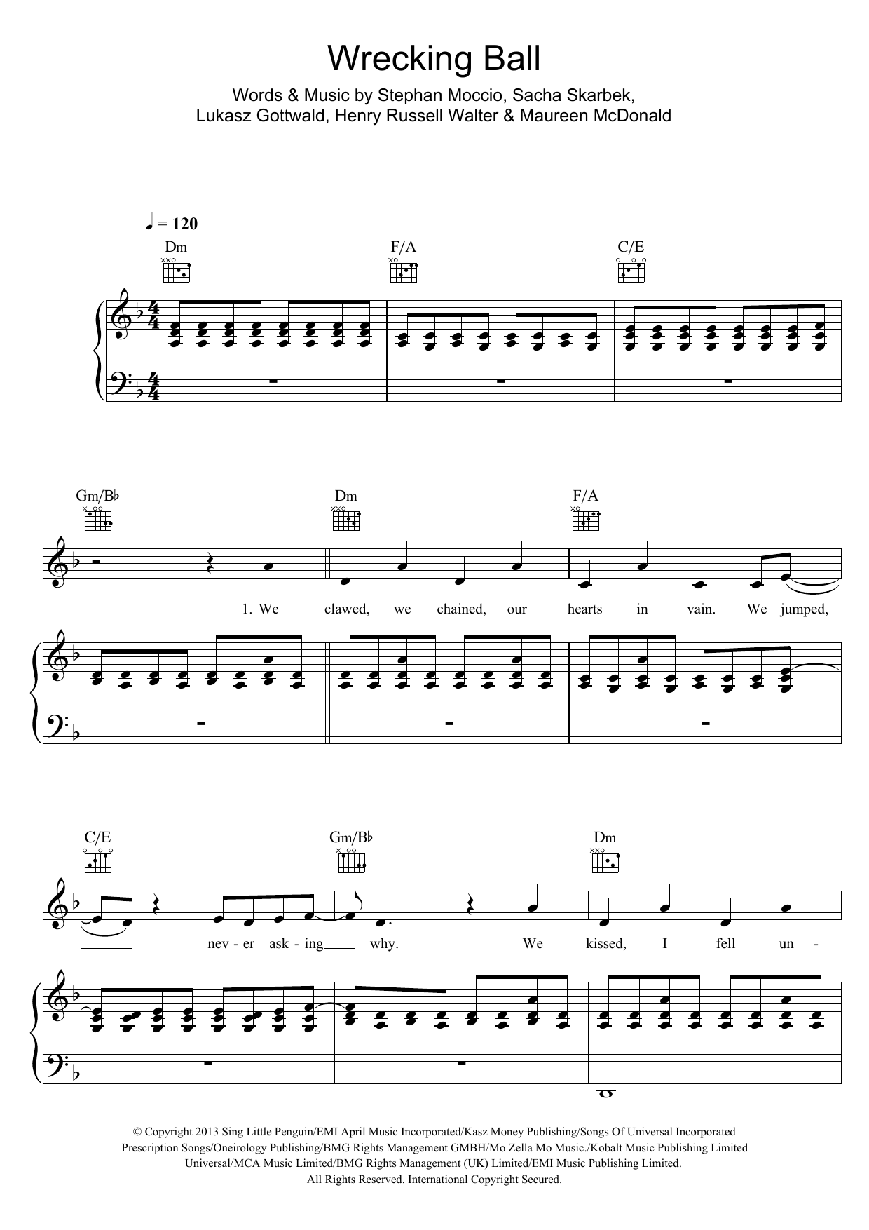 Download or print Miley Cyrus Wrecking Ball sheet music, chords and digital score arranged for Really Easy Piano. This Pop score includes 3 page(s).