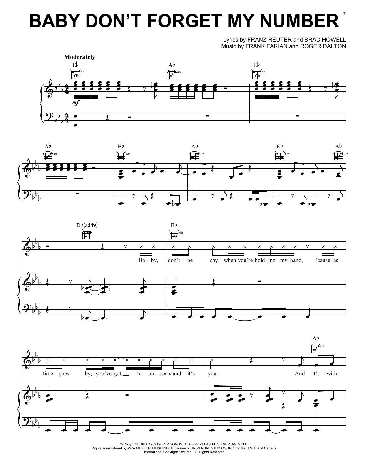 Download or print Milli Vanilli Baby Don't Forget My Number sheet music, chords and digital score arranged for Piano, Vocal & Guitar Chords (Right-Hand Melody). This Pop score includes 7 page(s).