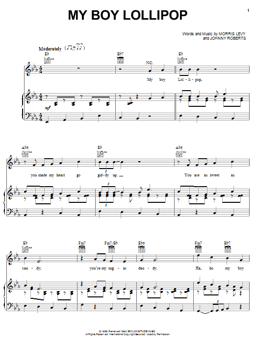 Download or print Millie Small My Boy Lollipop sheet music, chords and digital score arranged for Piano, Vocal & Guitar Chords (Right-Hand Melody). This Pop score includes 3 page(s).