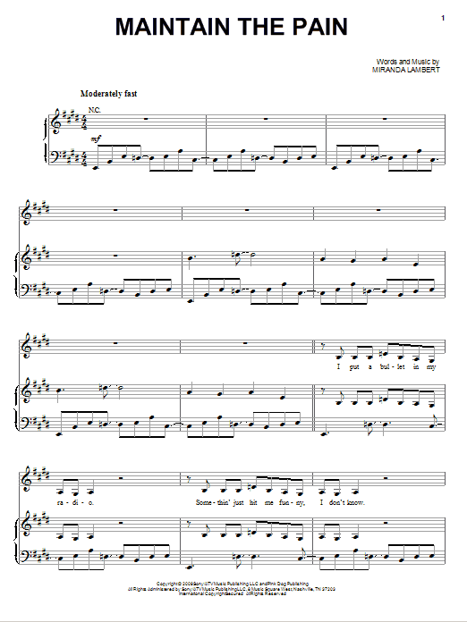 Download or print Miranda Lambert Maintain The Pain sheet music, chords and digital score arranged for Piano, Vocal & Guitar Chords (Right-Hand Melody). This Country score includes 5 page(s).