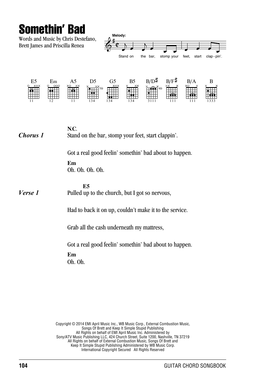 Download or print Miranda Lambert with Carrie Underwood Somethin' Bad sheet music, chords and digital score arranged for Guitar Chords/Lyrics. This Pop score includes 3 page(s).