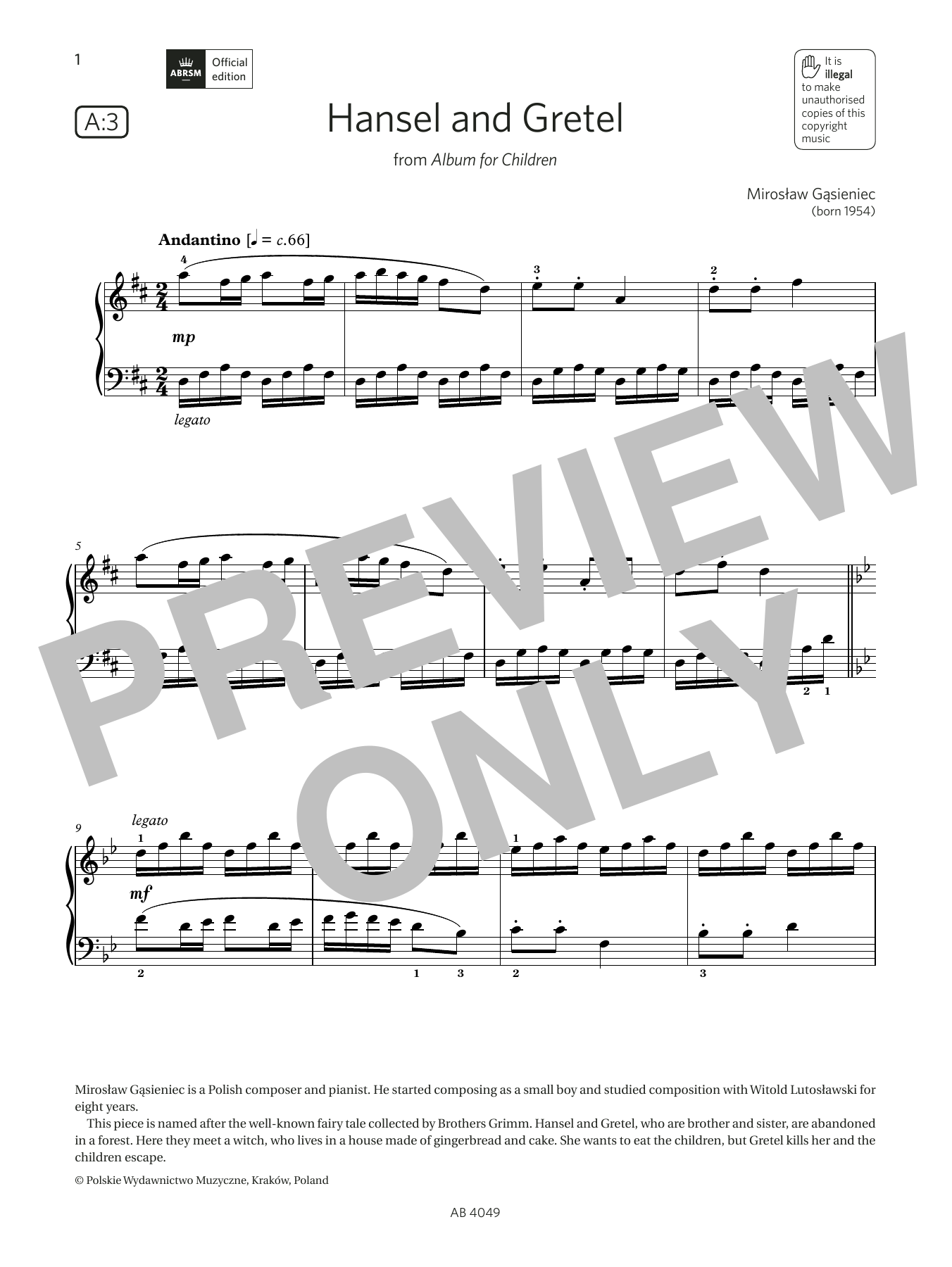 Download or print Mirosław Gąsieniec Hansel and Gretel (Grade 3, list A3, from the ABRSM Piano Syllabus 2023 & 2024) sheet music, chords and digital score arranged for Piano Solo. This Classical score includes 2 page(s).