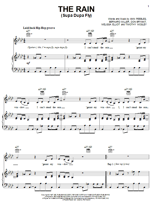 Download or print Missy Elliott The Rain (Supa Dupa Fly) sheet music, chords and digital score arranged for Piano, Vocal & Guitar Chords (Right-Hand Melody). This Hip-Hop score includes 6 page(s).