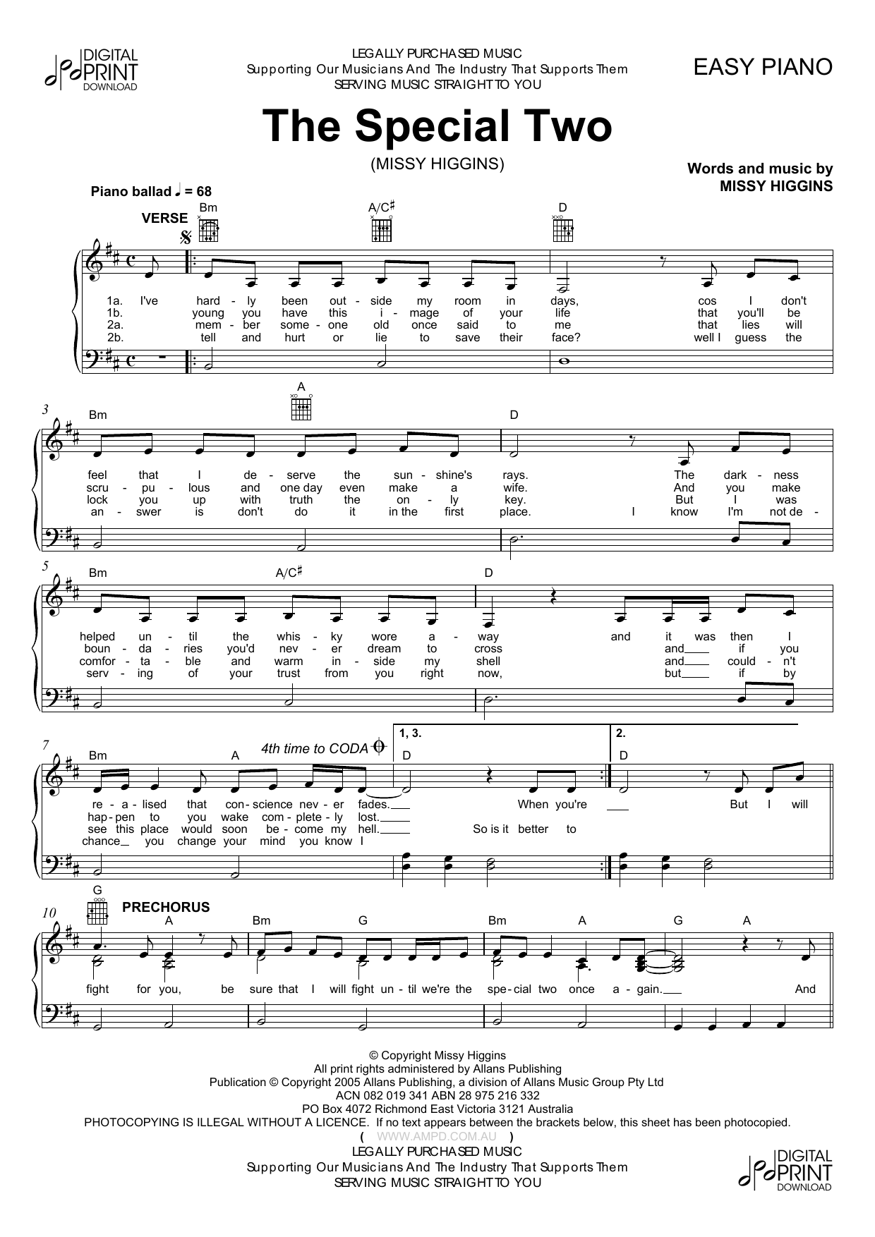 Download or print Missy Higgins The Special Two sheet music, chords and digital score arranged for Easy Piano. This Pop score includes 3 page(s).