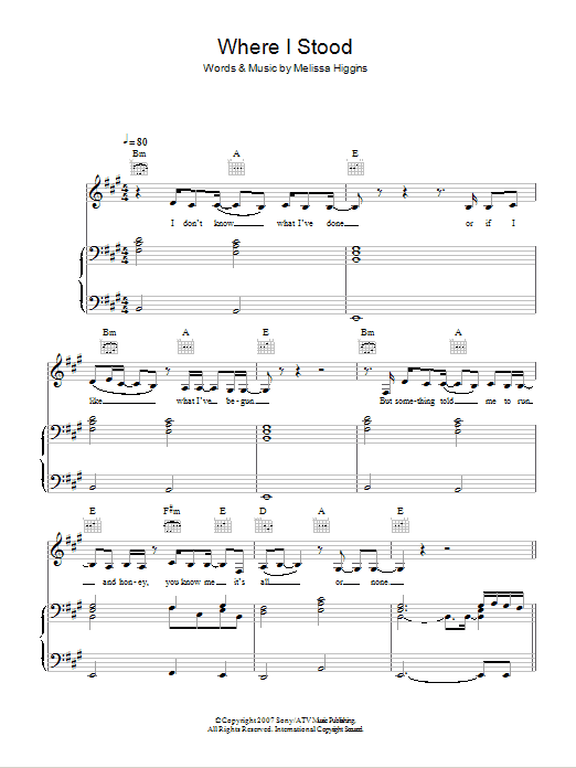 Download or print Missy Higgins Where I Stood sheet music, chords and digital score arranged for Easy Piano. This Pop score includes 3 page(s).
