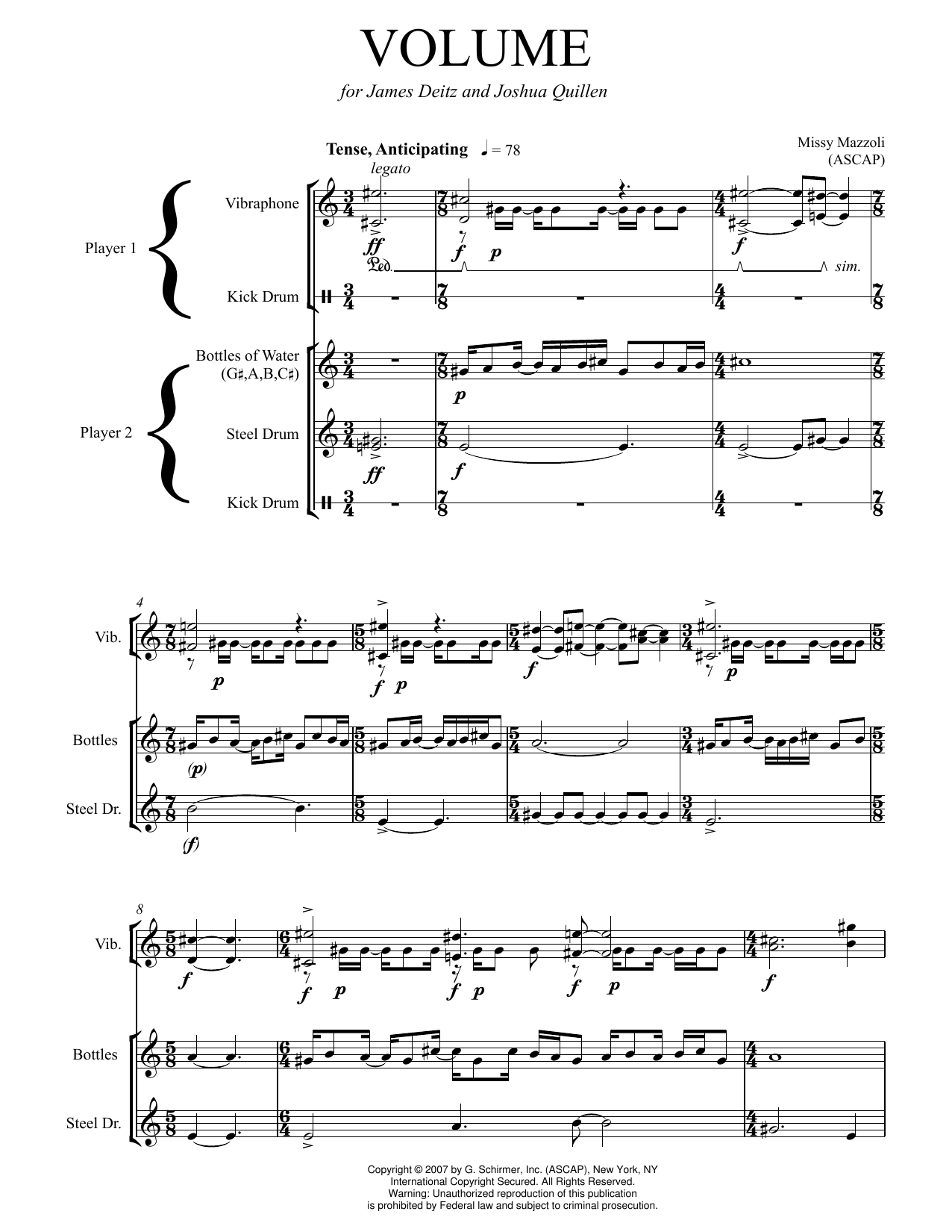 Download or print Missy Mazzoli Volume (steel drum and vibraphone version) sheet music, chords and digital score arranged for Chamber Group. This Classical score includes 38 page(s).