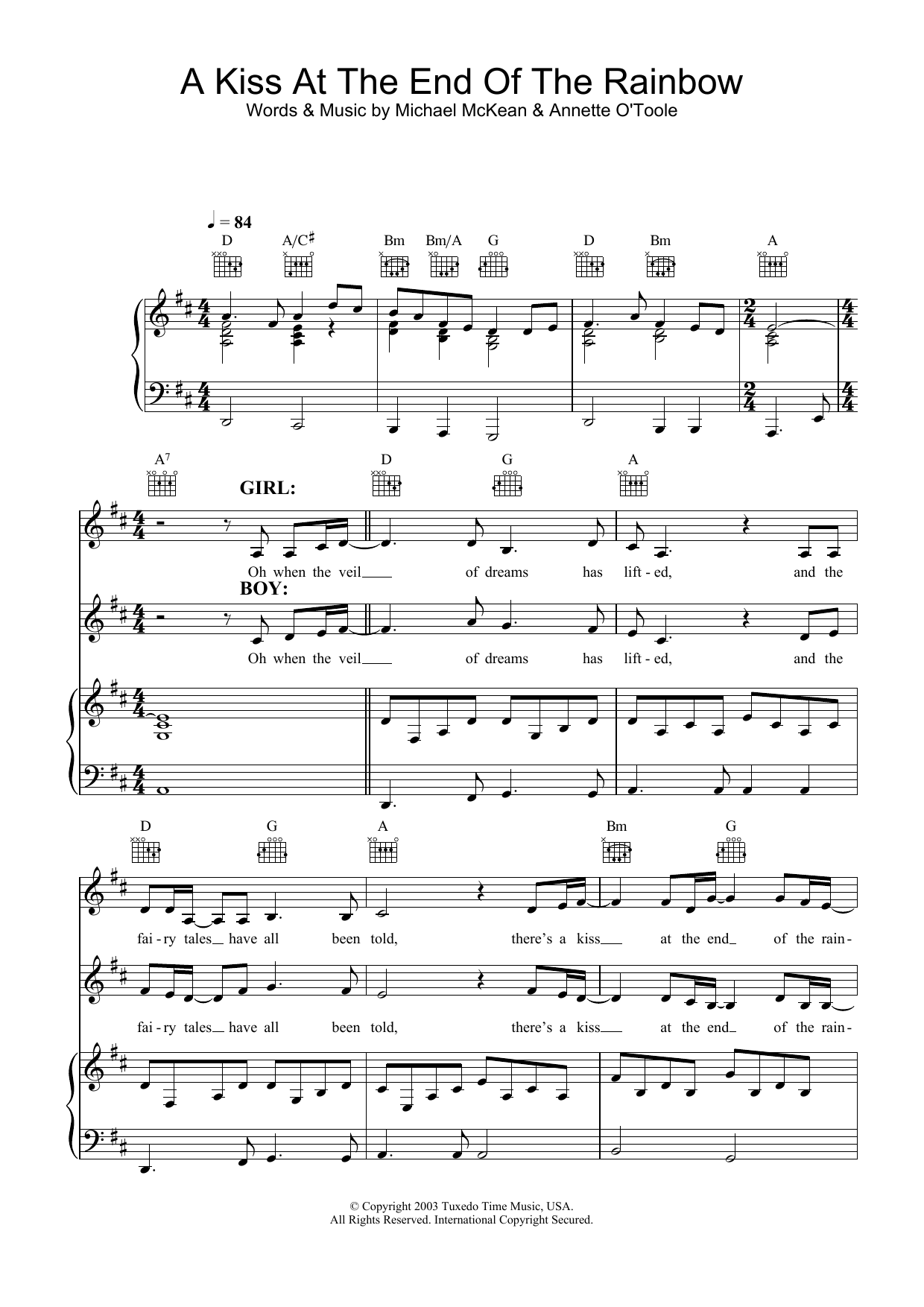 Download or print Mitch & Mickey A Kiss At The End Of The Rainbow sheet music, chords and digital score arranged for Piano, Vocal & Guitar Chords (Right-Hand Melody). This Film/TV score includes 3 page(s).