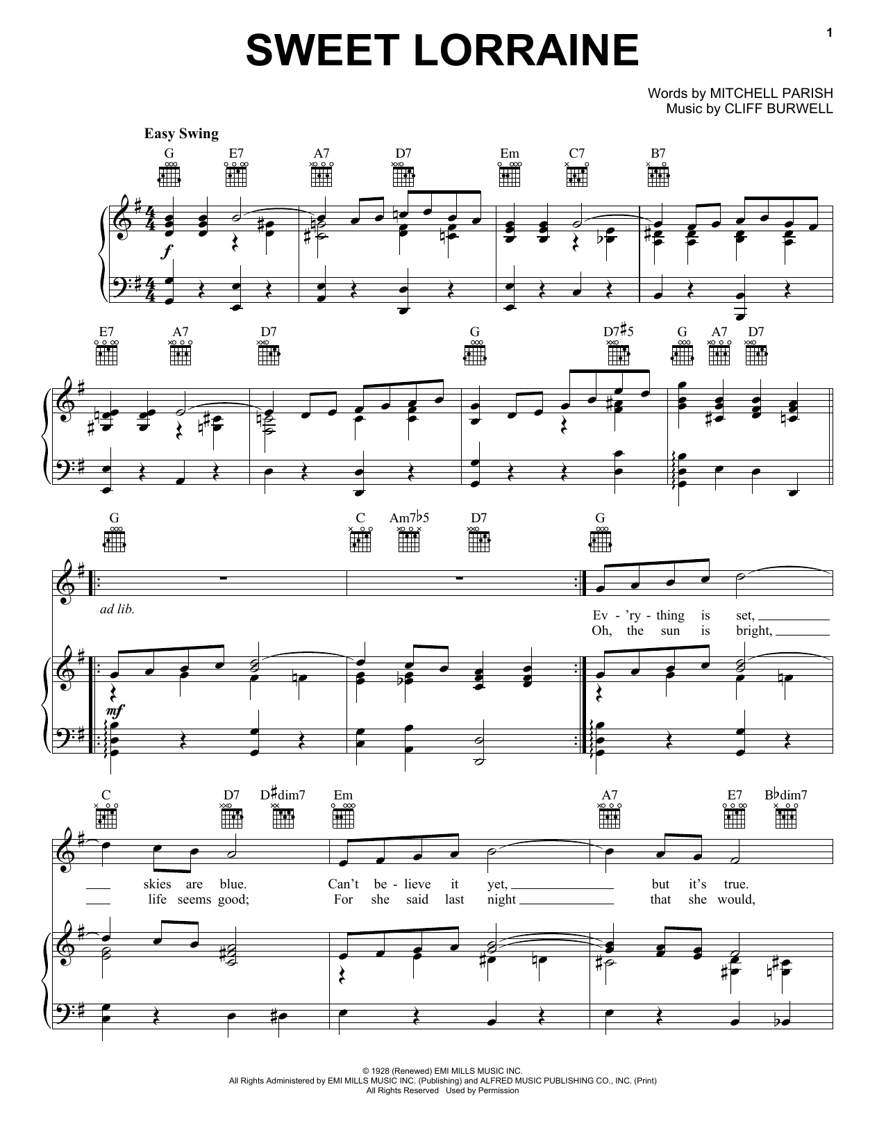 Download or print Mitchell Parish Sweet Lorraine sheet music, chords and digital score arranged for Piano, Vocal & Guitar Chords (Right-Hand Melody). This Jazz score includes 4 page(s).