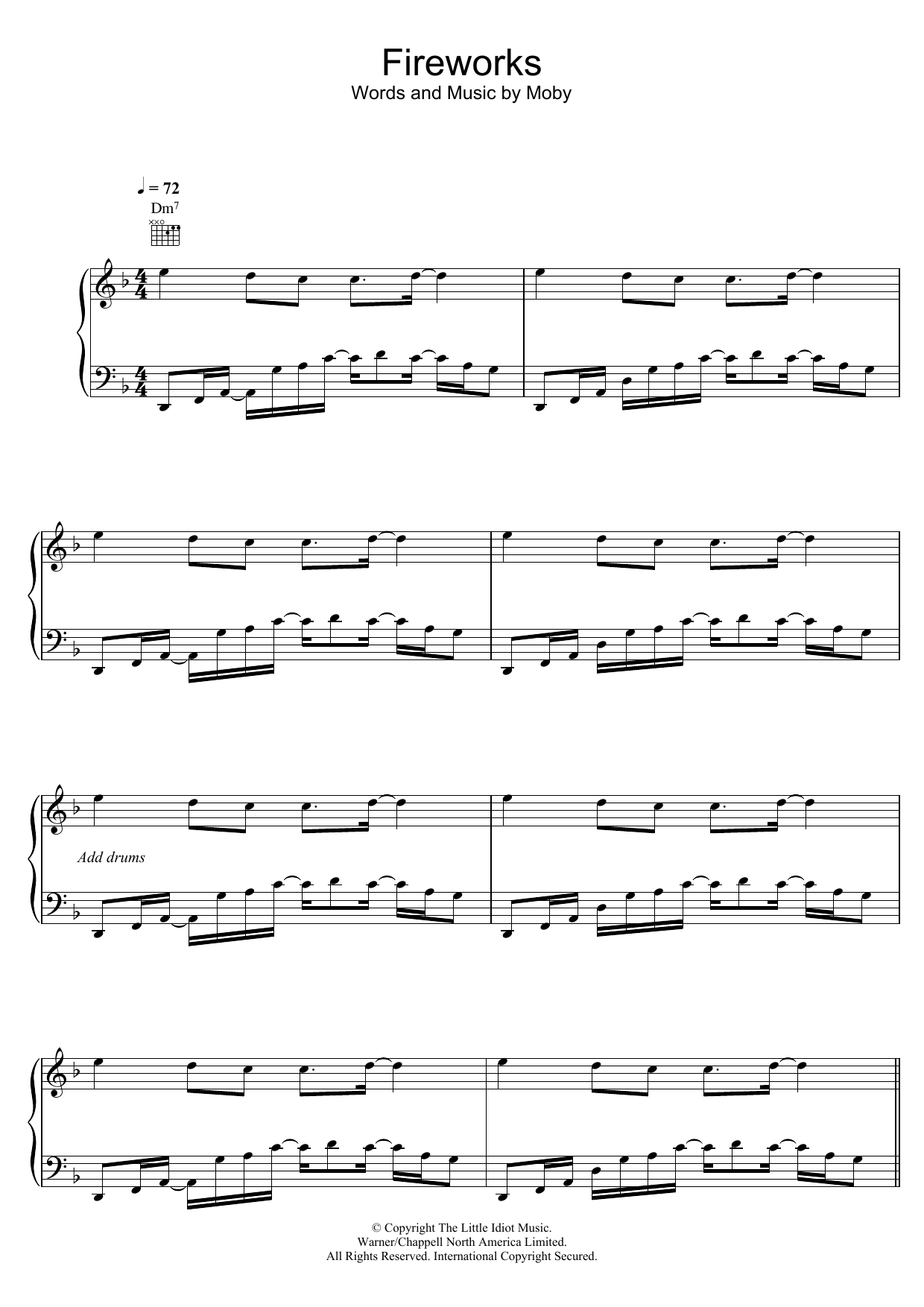 Download or print Moby Fireworks sheet music, chords and digital score arranged for Piano Solo. This Pop score includes 4 page(s).