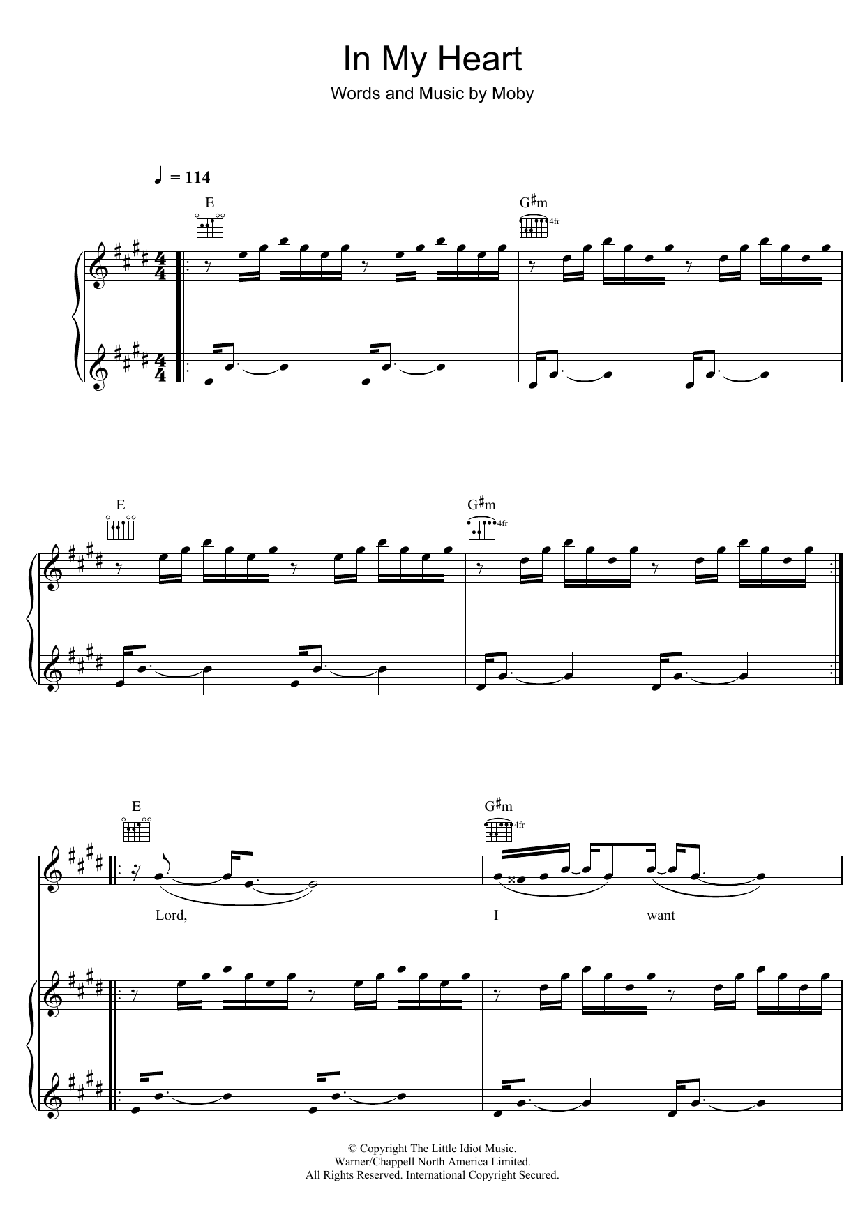 Download or print Moby In My Heart sheet music, chords and digital score arranged for Piano, Vocal & Guitar Chords. This Pop score includes 7 page(s).
