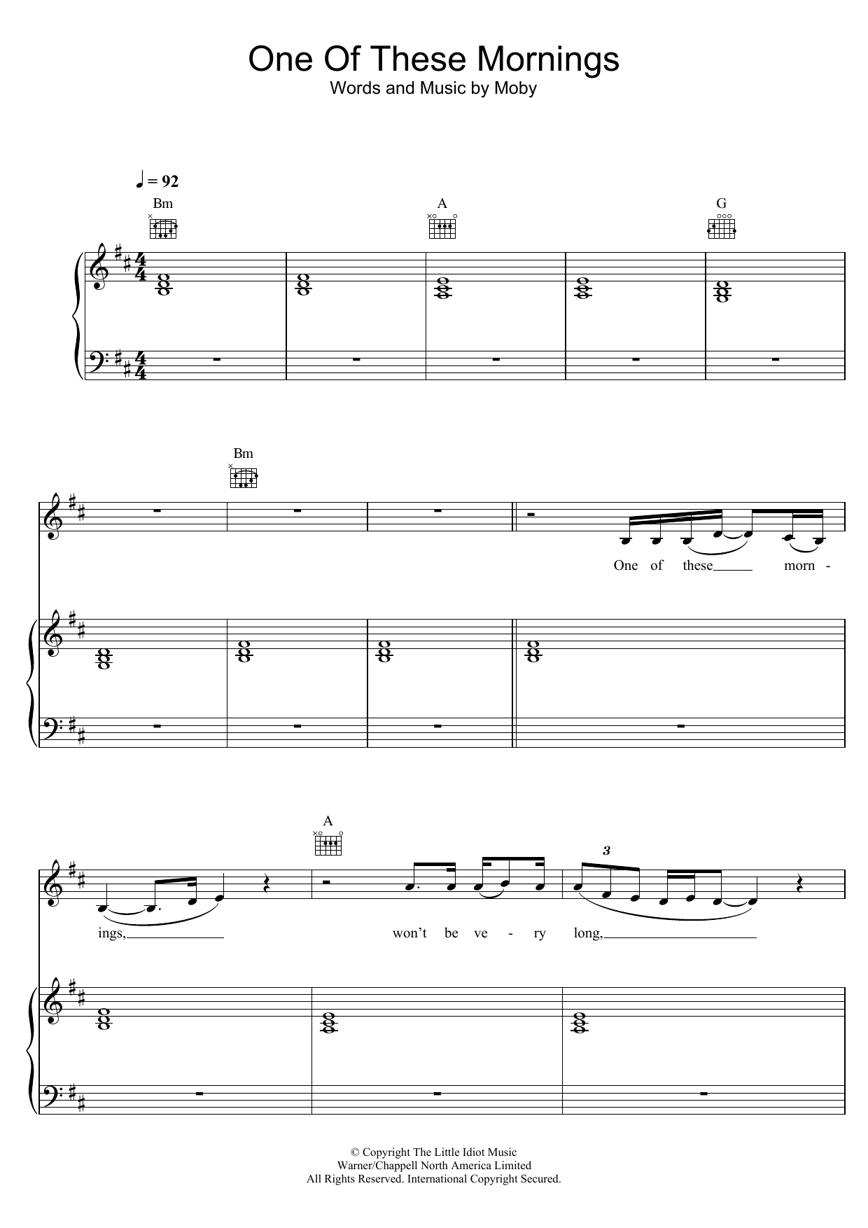 Download or print Moby One Of These Mornings sheet music, chords and digital score arranged for Piano, Vocal & Guitar Chords. This Pop score includes 6 page(s).