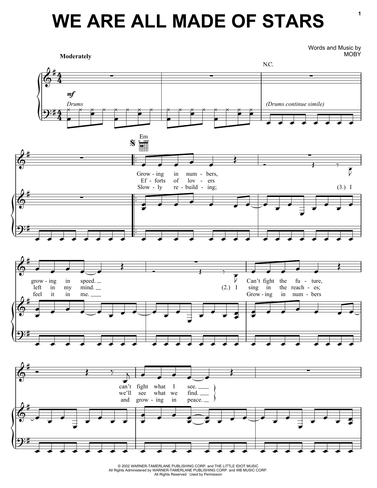 Download or print Moby We Are All Made Of Stars sheet music, chords and digital score arranged for Piano, Vocal & Guitar Chords (Right-Hand Melody). This Pop score includes 5 page(s).
