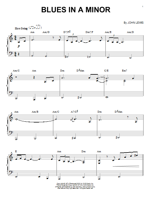 Download or print Modern Jazz Quartet Blues In A Minor (arr. Brent Edstrom) sheet music, chords and digital score arranged for Piano Solo. This Jazz score includes 5 page(s).