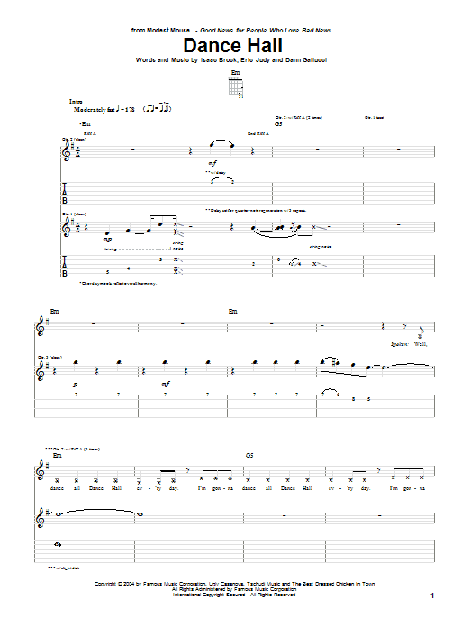 Download or print Modest Mouse Dance Hall sheet music, chords and digital score arranged for Guitar Tab. This Pop score includes 9 page(s).