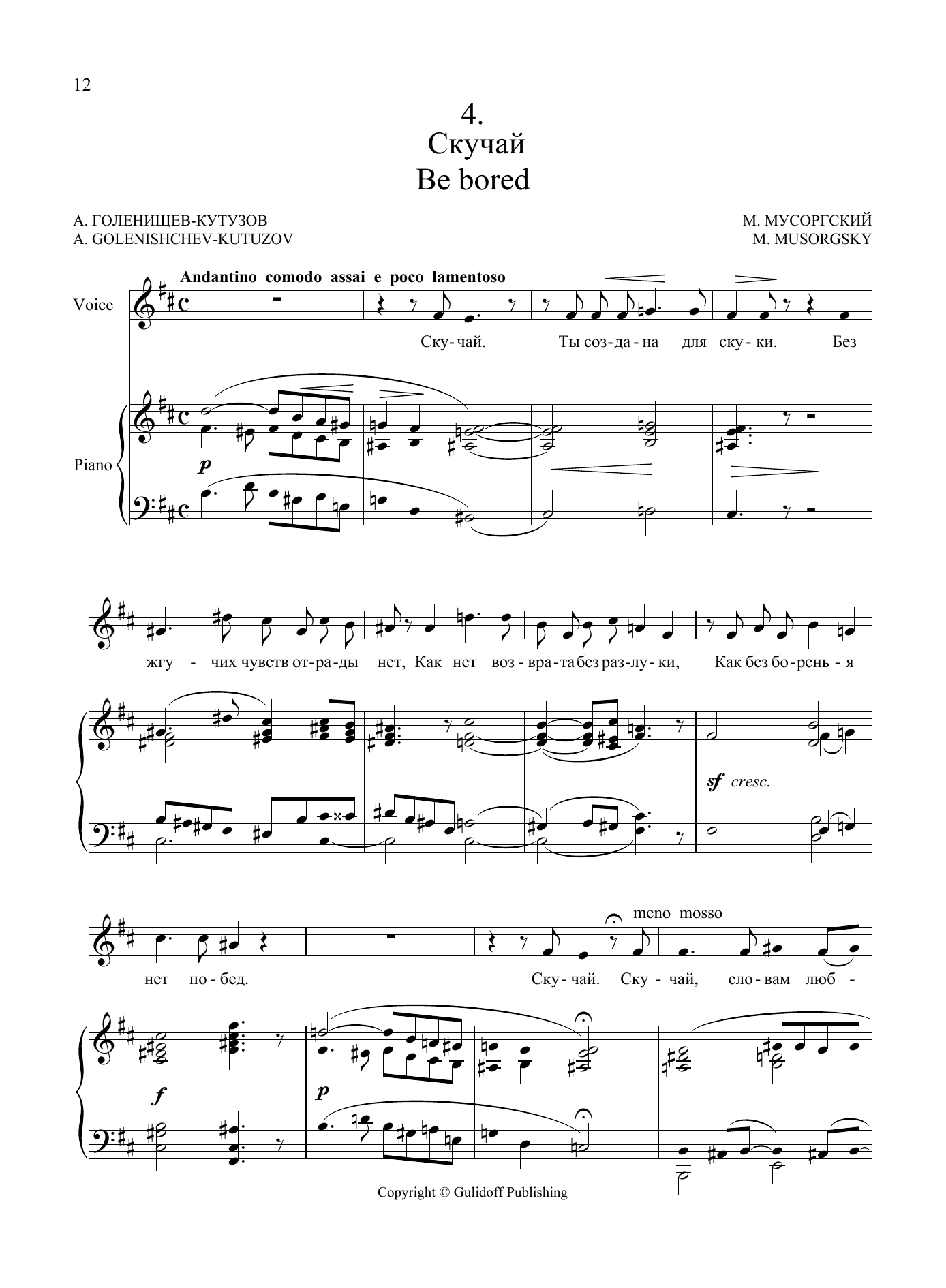 Download or print Modest Petrovich Mussorgsky Be bored, No. 4 from the Sunless song cycle sheet music, chords and digital score arranged for Piano & Vocal. This Classical score includes 2 page(s).