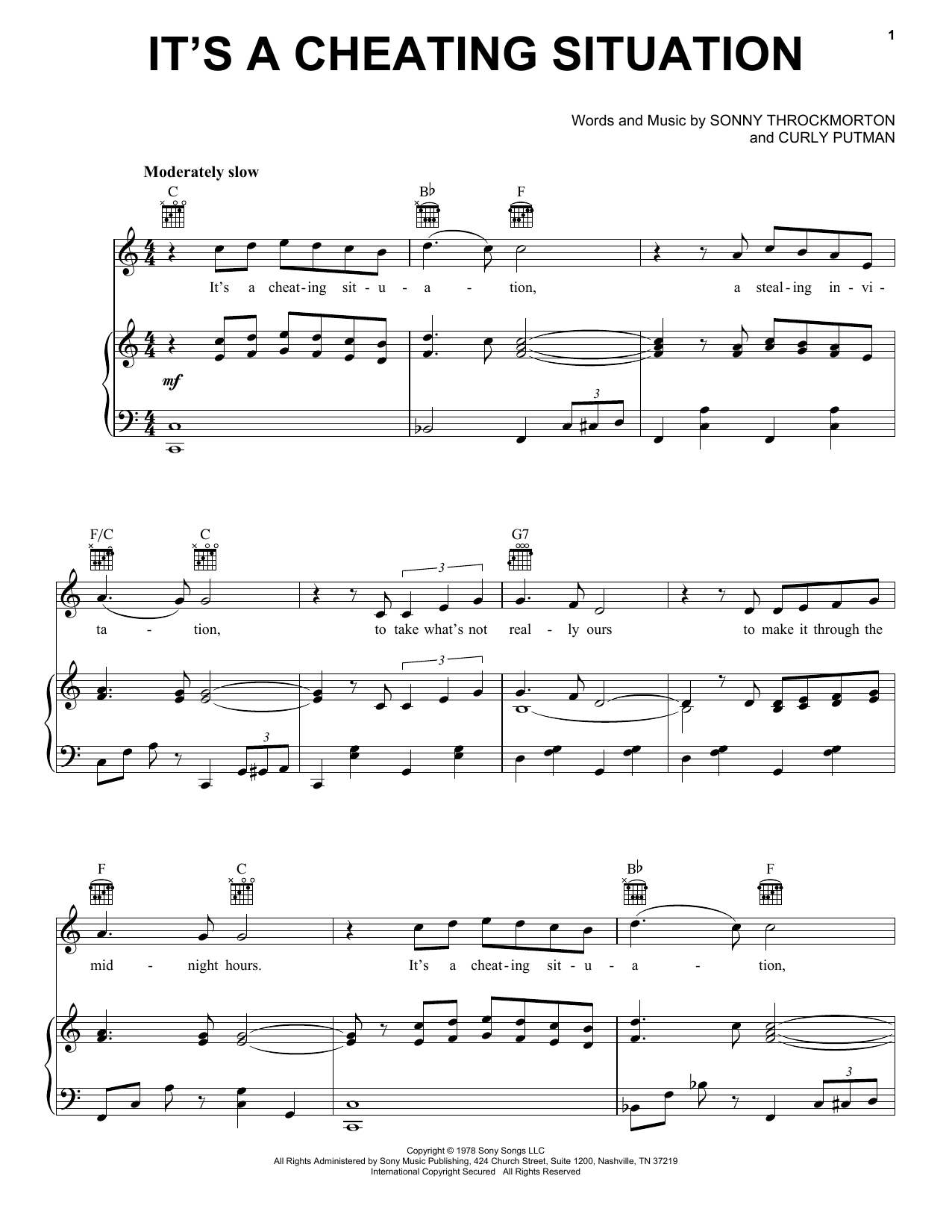 Download or print Moe Bandy It's A Cheating Situation sheet music, chords and digital score arranged for Piano, Vocal & Guitar Chords (Right-Hand Melody). This Country score includes 3 page(s).