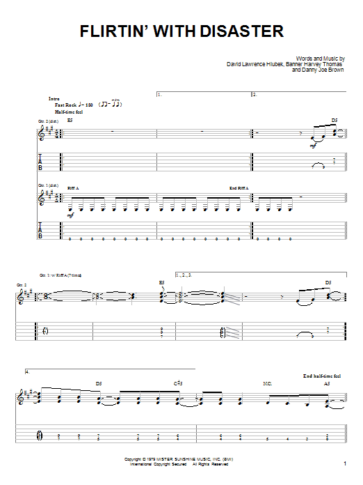 Download or print Molly Hatchet Flirtin' With Disaster sheet music, chords and digital score arranged for Guitar Tab (Single Guitar). This Metal score includes 12 page(s).