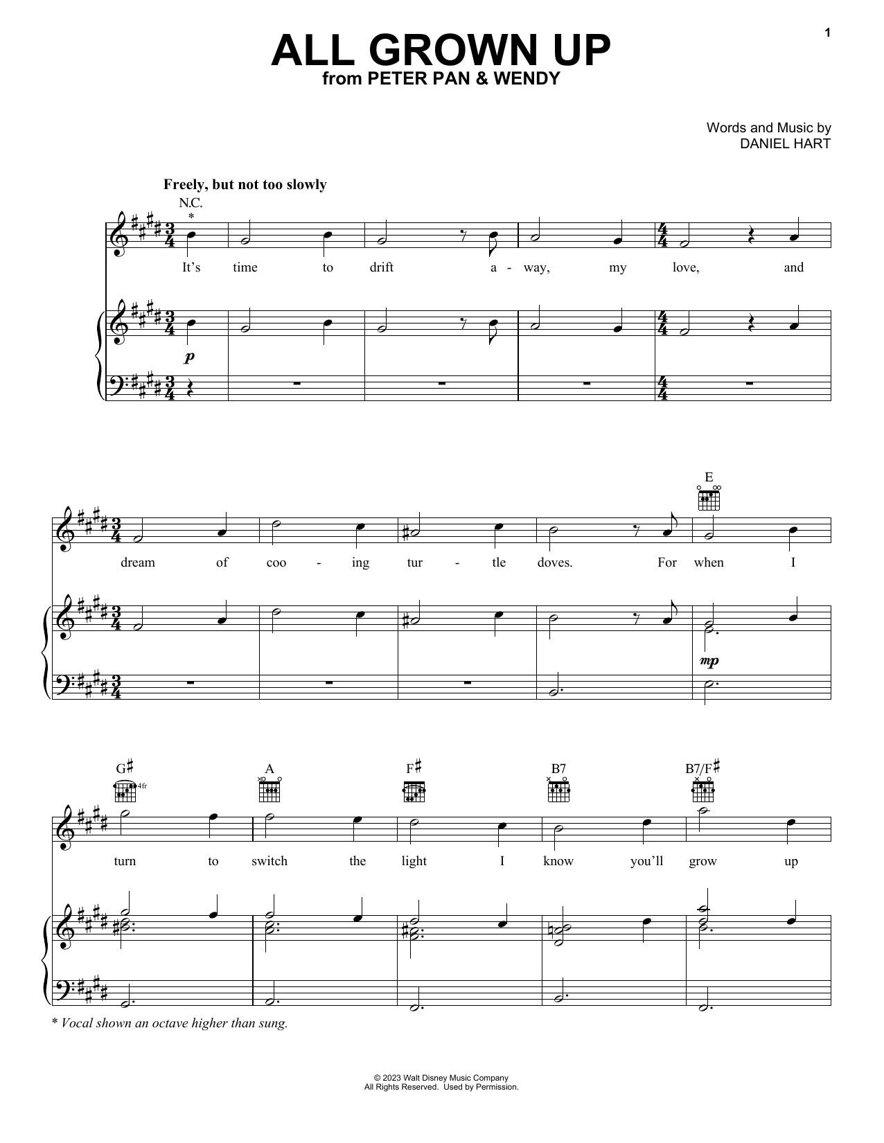 Download or print Molly Parker All Grown Up (from Peter Pan & Wendy) sheet music, chords and digital score arranged for Piano, Vocal & Guitar Chords (Right-Hand Melody). This Disney score includes 2 page(s).