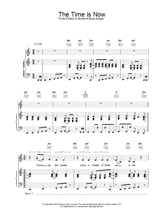 Download or print Moloko The Time Is Now sheet music, chords and digital score arranged for Guitar Chords/Lyrics. This Pop score includes 3 page(s).