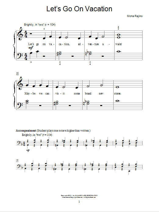 Download or print Mona Rejino Let's Go On Vacation sheet music, chords and digital score arranged for Educational Piano. This Children score includes 3 page(s).