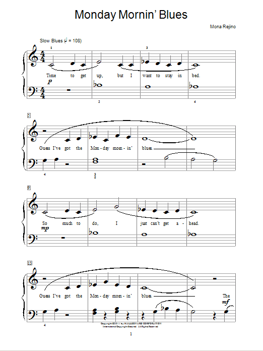 Download or print Mona Rejino Monday Mornin' Blues sheet music, chords and digital score arranged for Educational Piano. This Blues score includes 2 page(s).