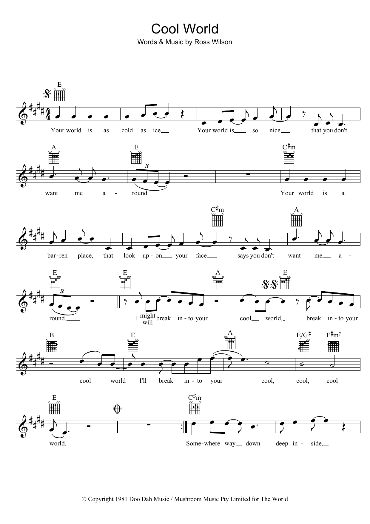 Download or print Mondo Rock Cool World sheet music, chords and digital score arranged for Piano, Vocal & Guitar Chords (Right-Hand Melody). This Pop score includes 5 page(s).