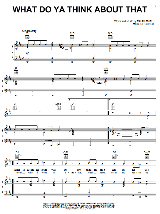 Download or print Montgomery Gentry What Do Ya Think About That sheet music, chords and digital score arranged for Piano, Vocal & Guitar Chords (Right-Hand Melody). This Country score includes 6 page(s).