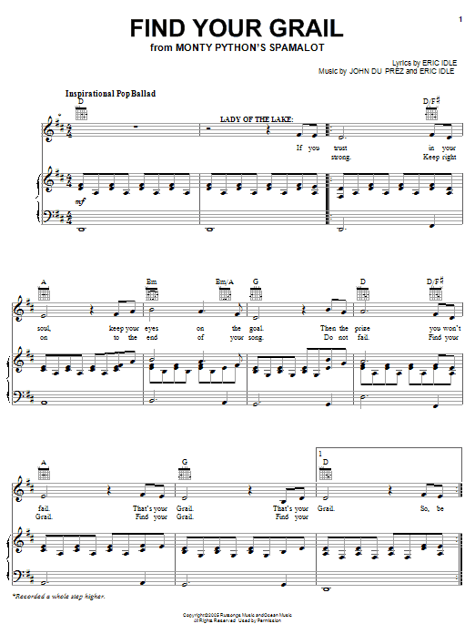 Download or print Monty Python's Spamalot Find Your Grail sheet music, chords and digital score arranged for Lead Sheet / Fake Book. This Musical/Show score includes 2 page(s).