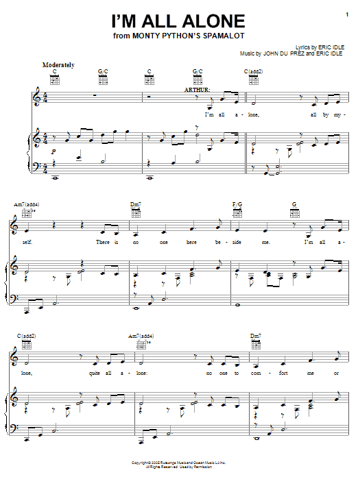 Download or print Monty Python's Spamalot I'm All Alone sheet music, chords and digital score arranged for Lead Sheet / Fake Book. This Musical/Show score includes 2 page(s).