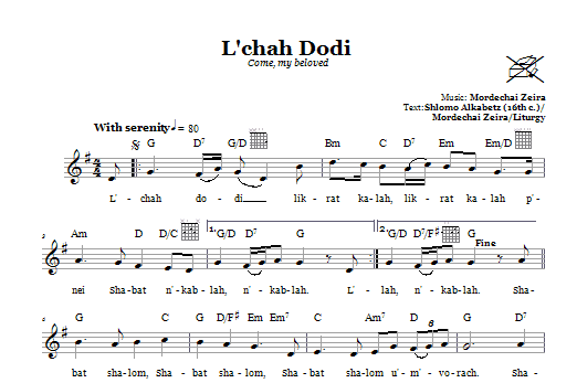 Download or print Mordechai Zeira L'chah Dodi (Come, My Beloved) sheet music, chords and digital score arranged for Lead Sheet / Fake Book. This Traditional score includes 1 page(s).