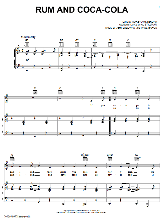 Download or print The Andrews Sisters Rum And Coca-Cola sheet music, chords and digital score arranged for Lead Sheet / Fake Book. This Standards score includes 2 page(s).