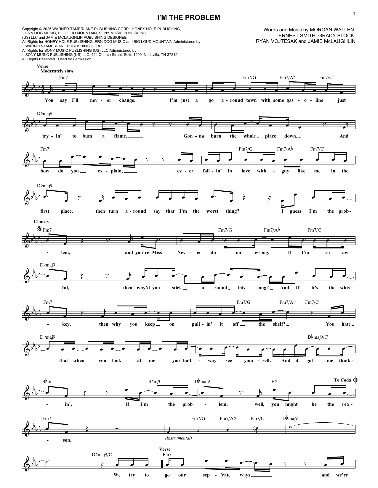 Download or print Morgan Wallen I'm The Problem sheet music, chords and digital score arranged for Lead Sheet / Fake Book. This Country score includes 2 page(s).