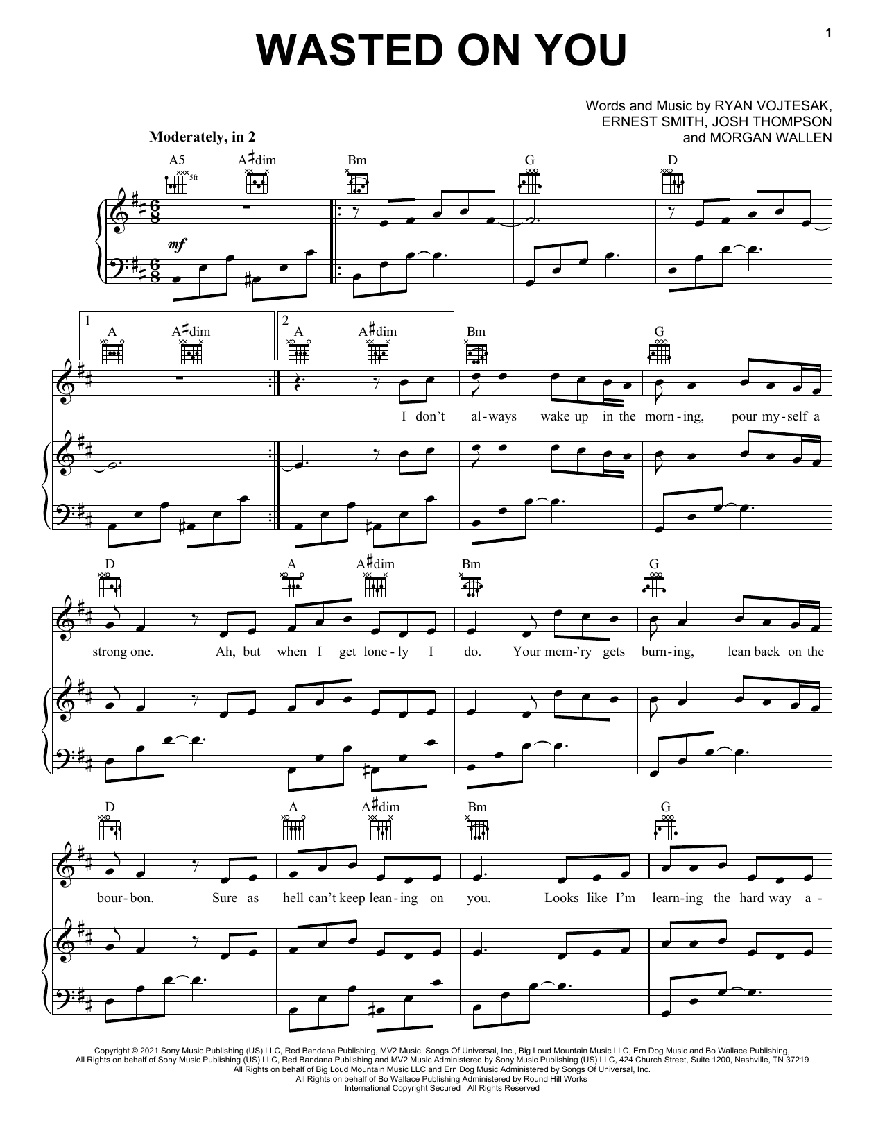 Download or print Morgan Wallen Wasted On You sheet music, chords and digital score arranged for Piano, Vocal & Guitar Chords (Right-Hand Melody). This Country score includes 5 page(s).