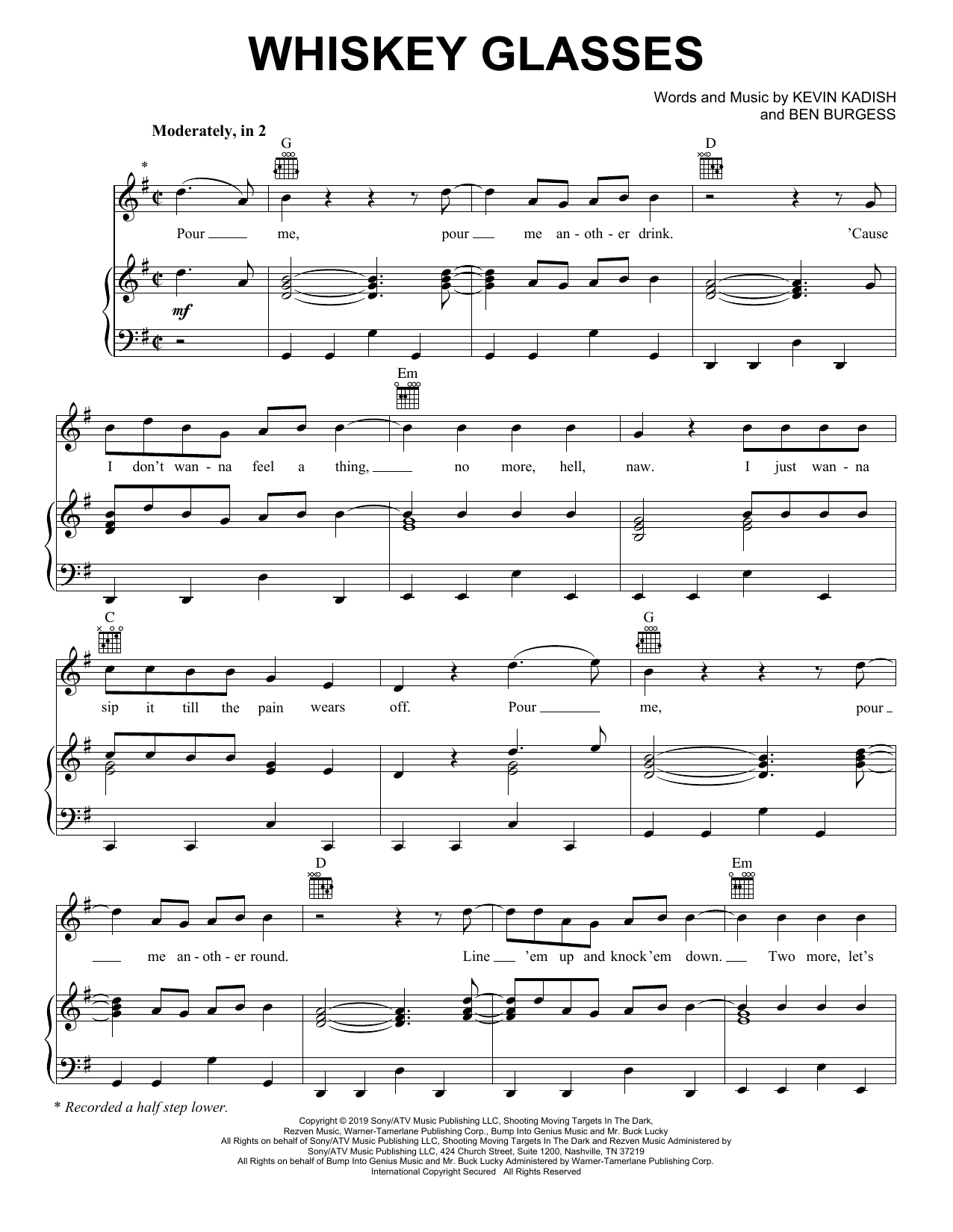 Download or print Morgan Wallen Whiskey Glasses sheet music, chords and digital score arranged for Piano, Vocal & Guitar Chords (Right-Hand Melody). This Country score includes 6 page(s).