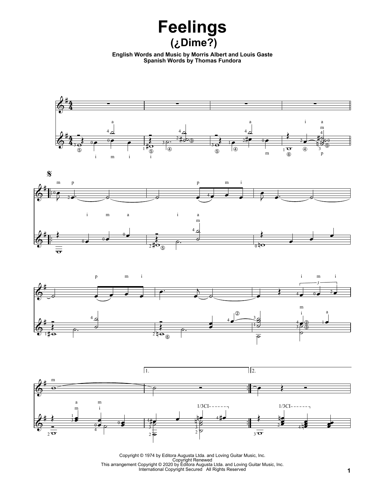Download or print Morris Albert Feelings (¿Dime?) sheet music, chords and digital score arranged for Solo Guitar. This Pop score includes 2 page(s).