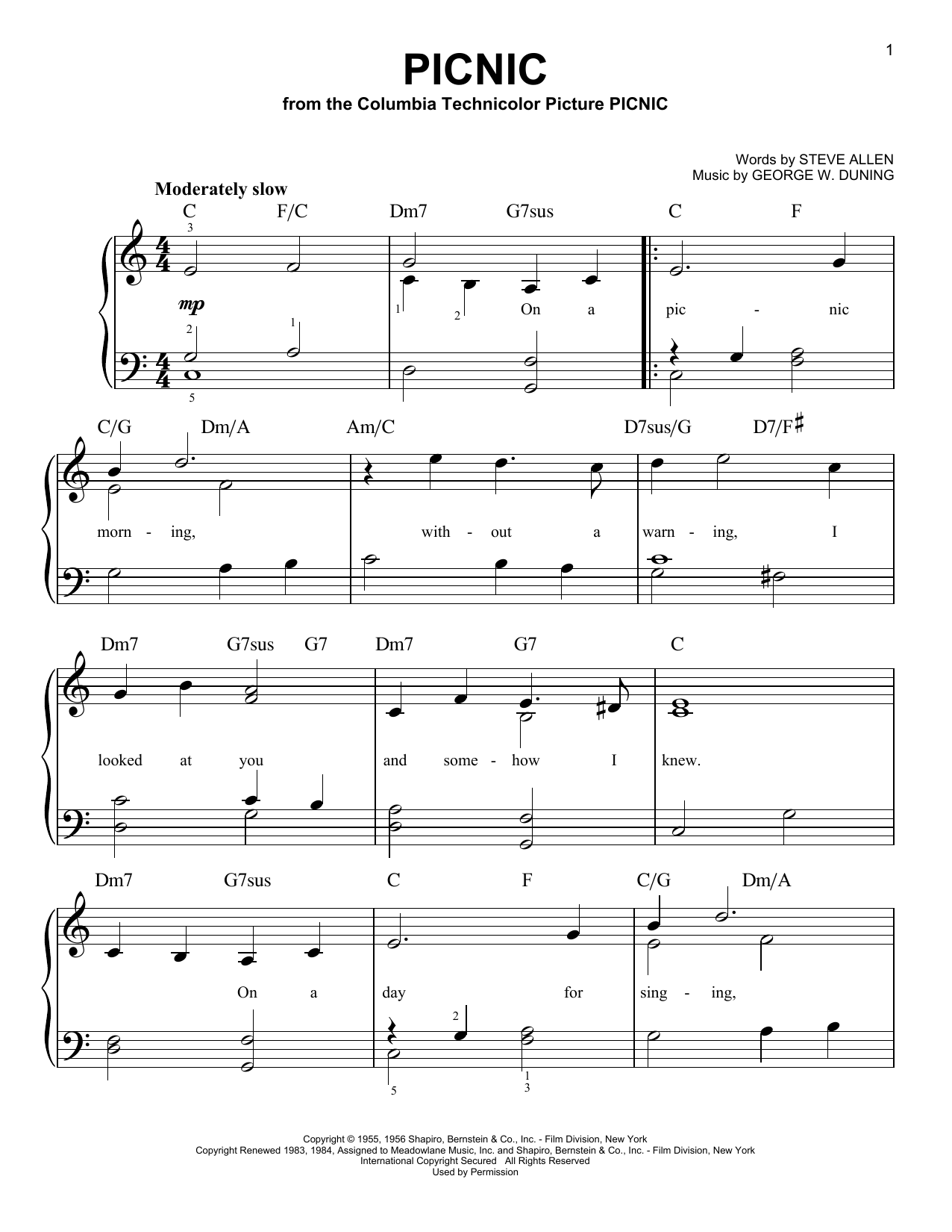 Download or print Morris Stoloff Picnic sheet music, chords and digital score arranged for Piano Solo. This Film/TV score includes 2 page(s).