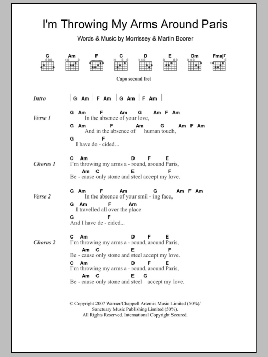Download or print Morrissey I'm Throwing My Arms Around Paris sheet music, chords and digital score arranged for Guitar Chords/Lyrics. This Rock score includes 2 page(s).