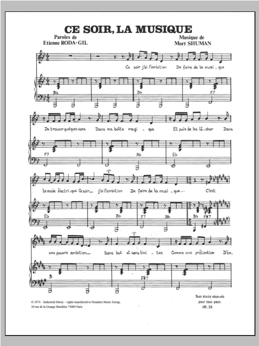 Download or print Mort Shuman Ce Soir La Musique sheet music, chords and digital score arranged for Piano, Vocal & Guitar Chords. This Pop score includes 3 page(s).