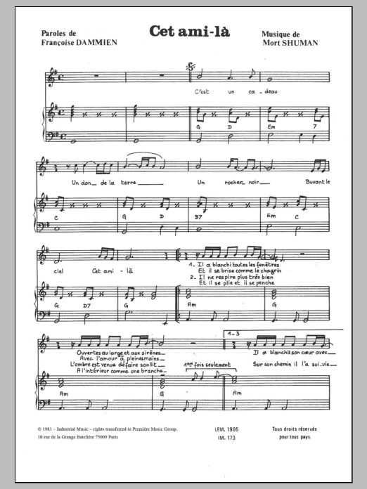 Download or print Mort Shuman Cet Ami La sheet music, chords and digital score arranged for Piano & Vocal. This French score includes 2 page(s).