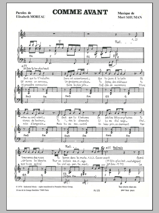 Download or print Mort Shuman Comme Avant (Comme Avant Vous) sheet music, chords and digital score arranged for Piano & Vocal. This French score includes 2 page(s).