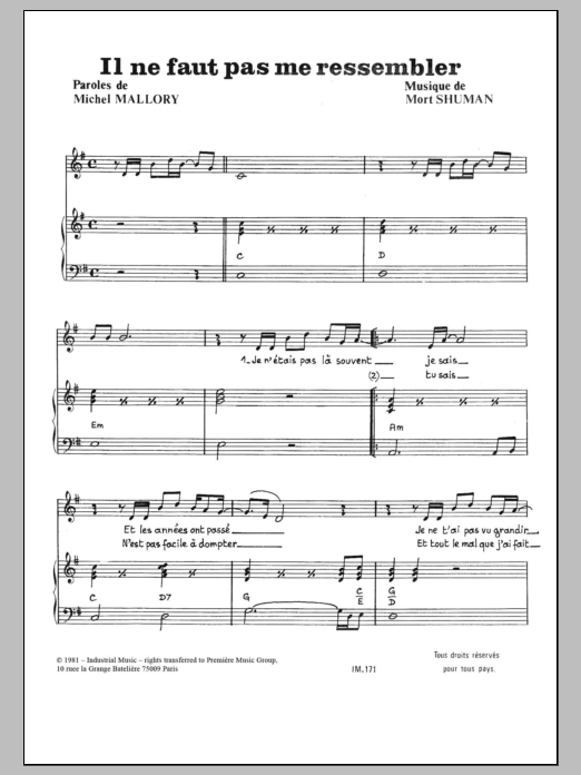 Download or print Mort Shuman Il Ne Faut Pas Me Ressembler sheet music, chords and digital score arranged for Piano & Vocal. This Pop score includes 3 page(s).