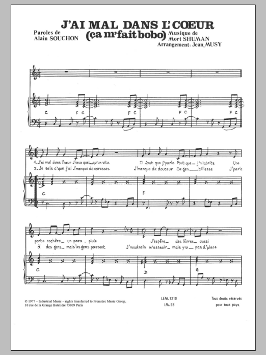 Download or print Mort Shuman J'ai Mal Dans L'coeur (Ca Me Fait Bobo) sheet music, chords and digital score arranged for Piano & Vocal. This Pop score includes 3 page(s).