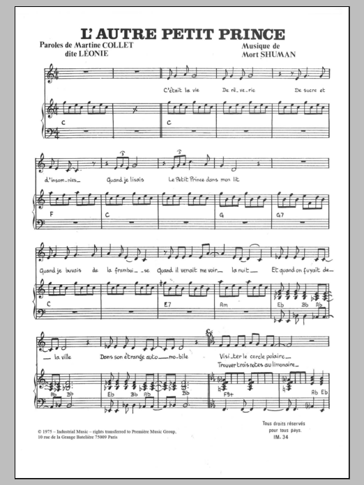 Download or print Mort Shuman L'Autre Petit Prince sheet music, chords and digital score arranged for Piano & Vocal. This Pop score includes 3 page(s).