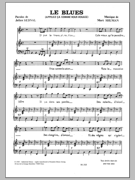 Download or print Mort Shuman Le Blues sheet music, chords and digital score arranged for Piano & Vocal. This Pop score includes 3 page(s).