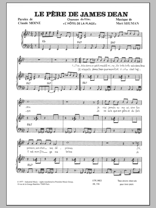 Download or print Mort Shuman Le Pere De James Dean sheet music, chords and digital score arranged for Piano & Vocal. This Pop score includes 3 page(s).