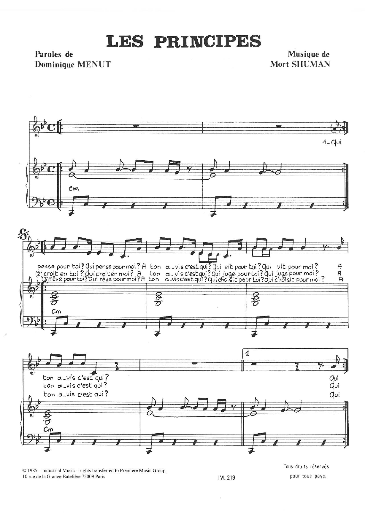 Download or print Mort Shuman Les Principes sheet music, chords and digital score arranged for Piano & Vocal. This Standards score includes 2 page(s).