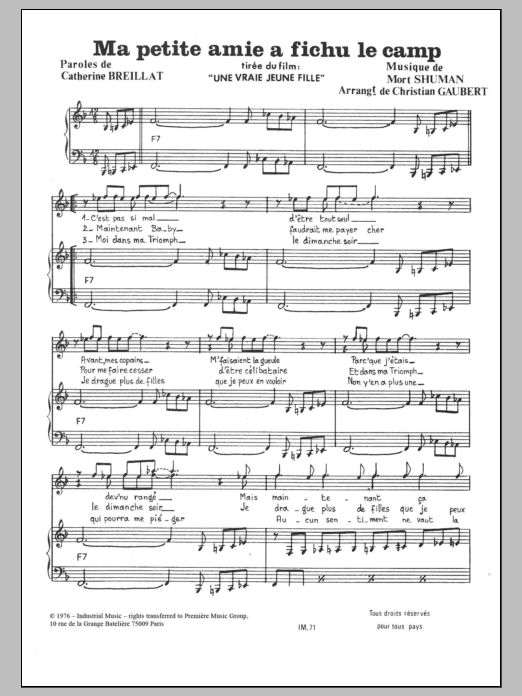 Download or print Mort Shuman Ma Petite Amie A Fichu Le Camp sheet music, chords and digital score arranged for Piano & Vocal. This Pop score includes 2 page(s).