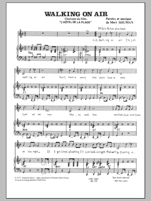 Download or print Mort Shuman Walking On Air sheet music, chords and digital score arranged for Piano & Vocal. This Pop score includes 2 page(s).
