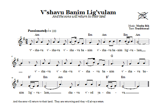 Download or print Moshe Bik V'shavu Banim Lig'vulam (And The Sons Will Return To Their Land) sheet music, chords and digital score arranged for Lead Sheet / Fake Book. This Traditional score includes 1 page(s).